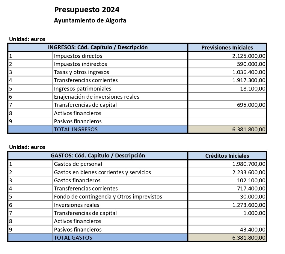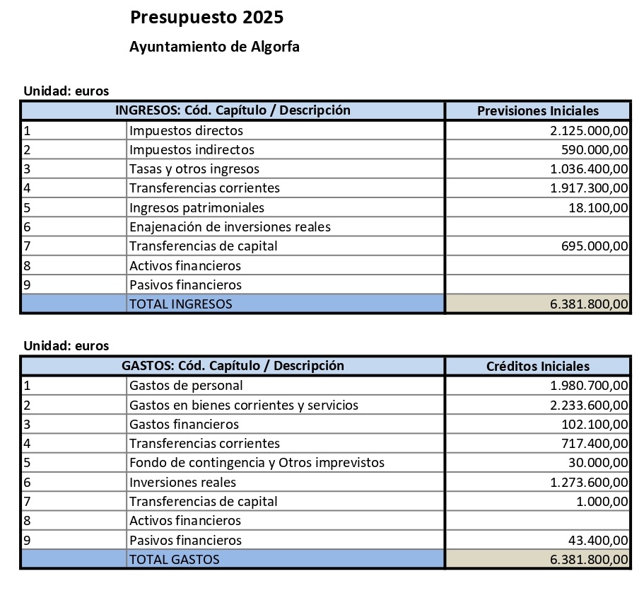 Presupuesto municipal PRESUPUESTO 2025 Presupuesto 2025 completo – Ayuntamiento de AlgorfaDescarga Fuente: Ministerio de Hacienda PRESUPUESTO 2024 Presupuesto 2024 completo – Ayuntamiento de AlgorfaDescarga Ejecución presupuestaria Modificaciones presupuestarias Liquidación presupuestaria Informes sobre estabilidad presupuestaria y sostenibilidad financiera